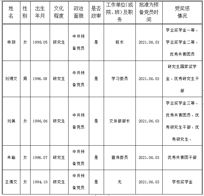 经党支部研究,拟吸收申玥等五位同志转为中共正式党员,现将其基本情况予以公示。在公示期内,欢迎广大党员、干部、群众通过信函、电话或直接到党支部或上级党委部门反映公示对象思想品质、现实表现、廉洁自律、培养教育等方面的情况。公示时间为7天。