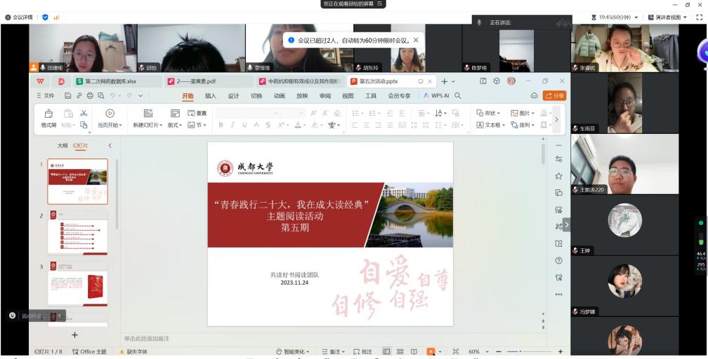(文/邱怡)为了让广大研究生同学更深入地学习党的百年发展历史,2023年11月24日,体育平台 2023级硕士研究生田靖瑶同学带领成都大学“共读好书”阅读团队在腾讯会议举行线上阅读分享会 。