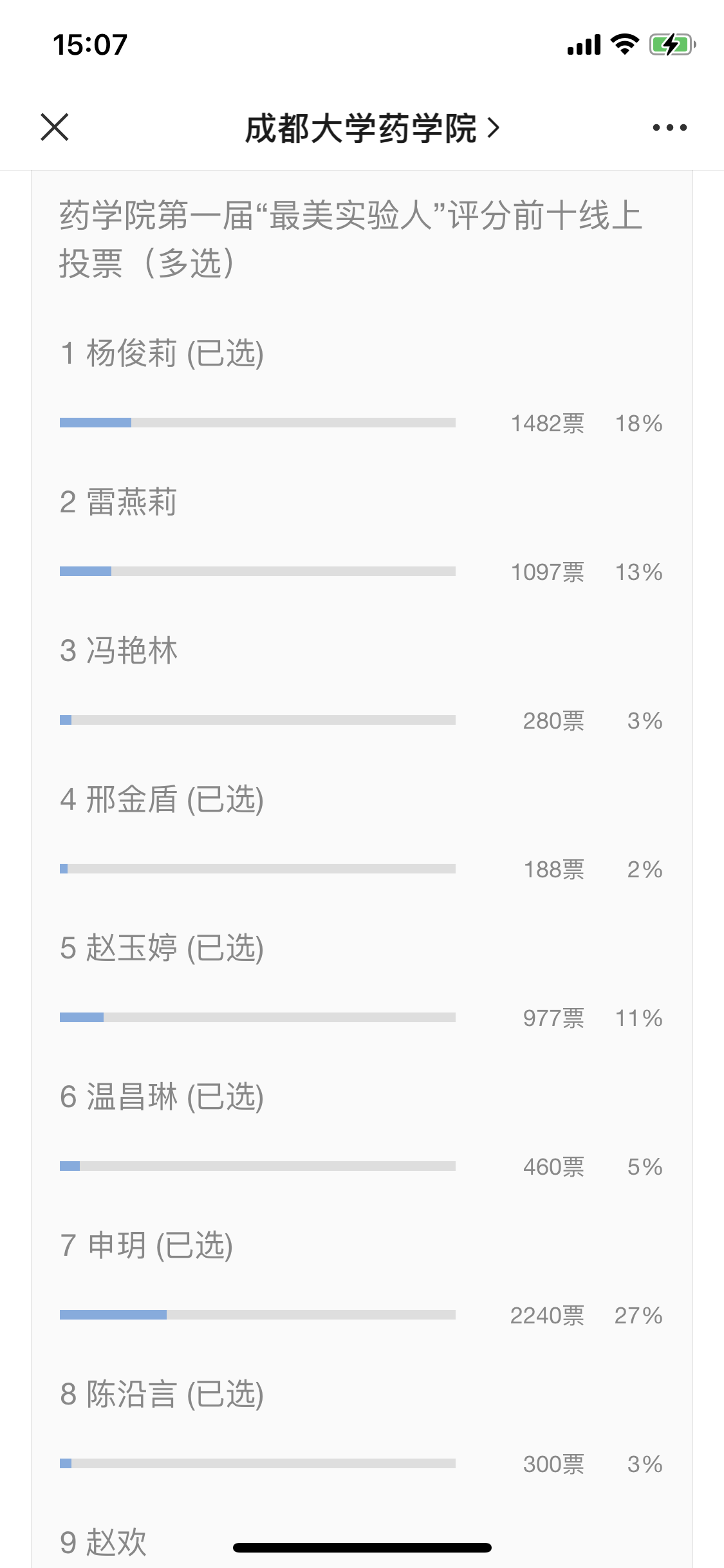 此次活动历时半个月,收到药学院多位研究生同学的踊跃投稿。活动要求每位 同学上传着实验服照片、实验记录本照片以及个人成长座右铭。经过老师评委打分选出综合分数前十名同学进入决赛,决赛方式为在体育平台 公众号中进行大众微信投票。活动微信投票环节得到了广大师生的热烈反响,积极为心目中的“最美”投上宝贵的一票。