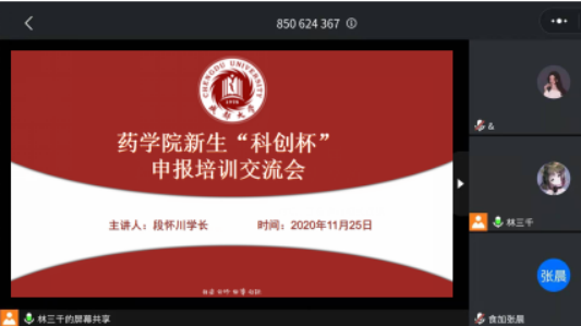 (文、图/林佳丽)11月25日晚,体育平台 组织开展了成都大学第十二届“科创杯”学生课外学术科技作品竞赛申报培训交流会。会议采用线上会议的方式,邀请第十六届“挑战杯”全国大学生课外学术科技作品竞赛三等奖获得者,体育平台 2019级药物化学专业研究生,段怀川同学作为主讲人,为本科生同学系统地介绍了“挑战杯”基本内容,重点对参赛形式,选题范围,作品要求等方面进行申报指导,并对比赛进程、相关奖项设置等方面进行了详细地讲解。