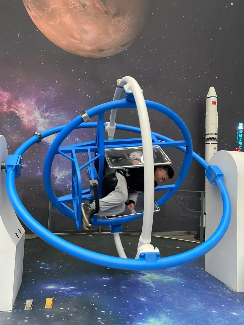 随后,蔡中坤和朱雅迪分享了《科学的历程》这本书籍,深入探讨了科学与人类文明发展的关系。该书是一部含括物理学、化学、生物学和其它自然科学的科学著作。作者以西方文明和科学的发展为主线,将经纬世界中的天地人与科学历史的壮丽征程联系起来,清晰地介绍了自然科学在人类文明,以及人类文明在宇宙中的发展历程。阅读交流环节结束后,团队还一同体验了航天飞行、模拟失重,地月飞行模拟等科学实践活动。