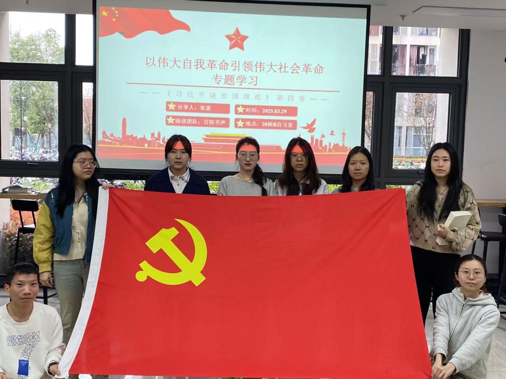“百院书声”阅读团队于2025年3月29日上午在20栋自习室开展了“以伟大自我革命引领伟大社会革命”专题学习。此次分享会由张惠同学分享《习近平谈治国理政》第四卷。