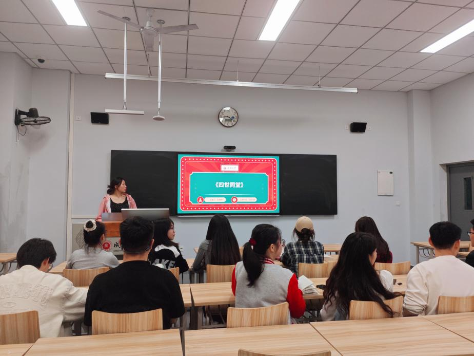 4月18日,校内分享活动在学校多功能厅举行。活动伊始,王雨婷同学作为PPT分享人,以生动的讲解和丰富的图片资料,为同学们详细解读了《四世同堂》这部经典作品。她从作品的时代背景、人物形象、主题思想等多方面展开,深入剖析了老舍先生笔下那个动荡年代中北京小羊圈胡同里普通百姓的生活百态,以及他们面对战争与苦难时的挣扎与坚守。