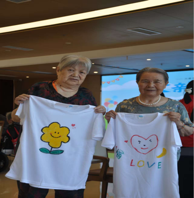 几个小时的创作在温馨氛围中落下帷幕。一件件素白T恤在长者手中化作独一无二的艺术珍品,不仅承载着节日的祝福,更成为情感的深情寄托。活动结束后,长者们自豪地展示亲手绘制的T恤,与志愿者、伙伴合影留念,幸福满足的笑容洋溢脸庞。