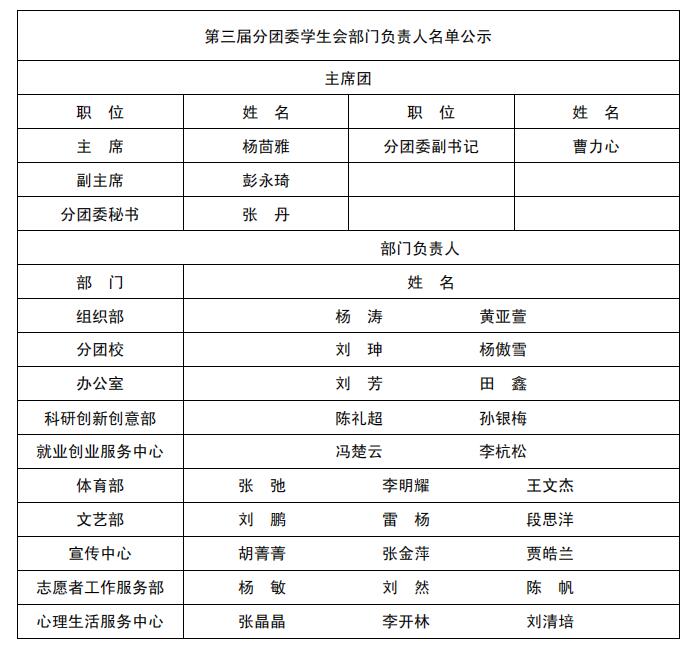 根据《成都大学学生会章程》和《校学生会干部选拔任用条例》的有关规定,本着公平、公开、公正的原则,经过自我推荐、民主评议、公开选举和十大体育平台 团委研究决定,现将拟任部门干部名单公示如下: