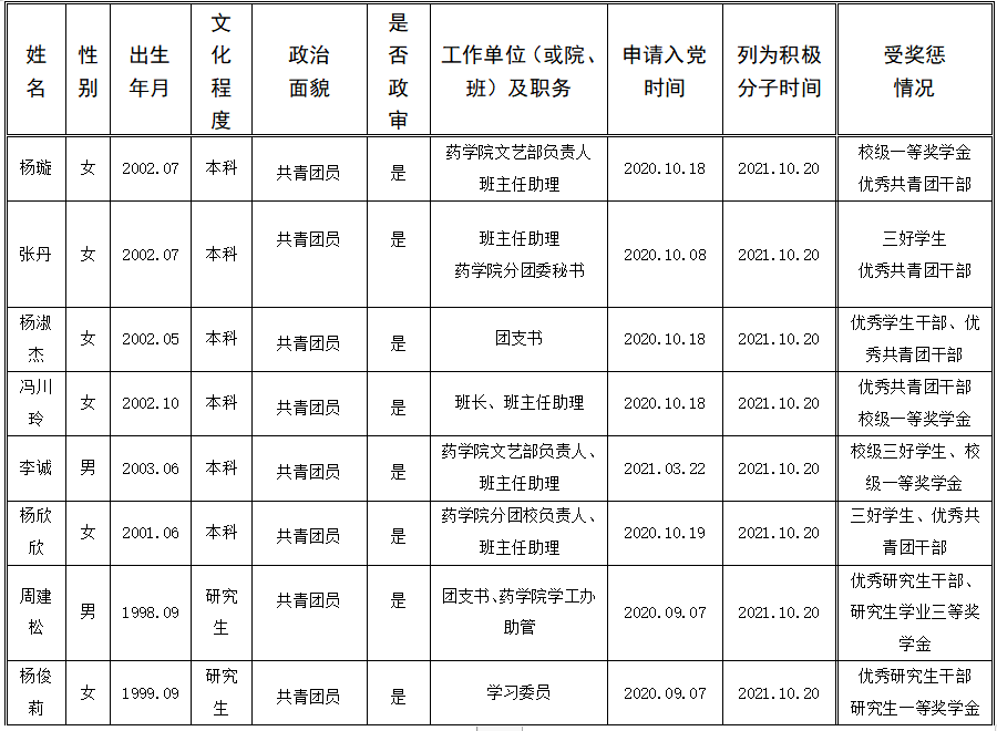 经党支部研究,拟吸收杨璇等同志为中共预备党员,现将其基本情况予以公示。在公示期内,欢迎广大党员、干部、群众通过信函、电话或直接到党支部或上级党委部门反映公示对象思想品质、现实表现、廉洁自律、培养教育等方面的情况。公示时间为7天。