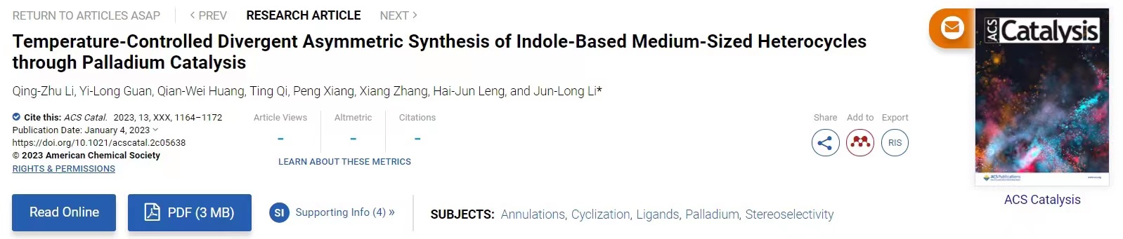 近日,体育平台 手性及仿生合成实验室李青竹博士在国际化学权威学术期刊《ACS Catalysis》(中科院一区Top期刊,IF: 13.7)上以成都大学为唯一通讯单位在线发表了题为“Temperature-Controlled Divergent Asymmetric Synthesis of Indole-Based Medium-Sized Heterocycles through Palladium Catalysis”的最新研究成果。