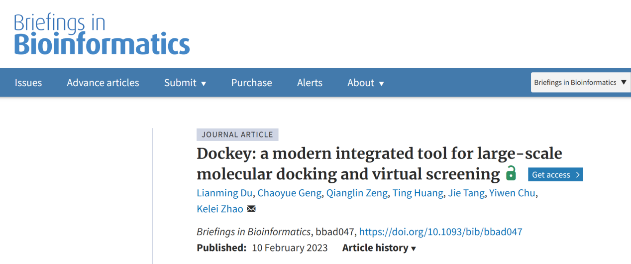 近日,体育平台 赵克雷课题组在生物信息学领域顶级期刊《Briefings in Bioinformatics》(JCR Q1,影响因子13.994)上发表题为“Dockey: a modern integrated tool for large-scale molecular docking and virtual screening”的最新研究成果。成都大学为第一单位,高等研究院杜联明副研究员为第一作者,赵克雷研究员为通讯作者。