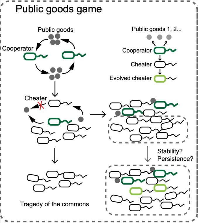 团队进一步以博弈论为理论背景,研究发现lasR和pvdS突变体由于具有相应的产胞外公共产物缺陷,能以行骗的方式轻易入侵原先的种群,并且可以在不同条件下与野生型铜绿假单胞菌共存,形成一种称为级联公共物品博弈的互动关系。最终,由lasR完整型和 lasR 突变型组成的多态种群可最大限度地减少宿主免疫波动,促进持续定植。这项研究展示了铜绿假单胞菌在适应宿主肺部过程中的多阶段进化和复杂的相互作用,并为公共物品博弈中合作行为的维持提供了解释。