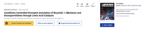 近日,体育平台 手性药物及仿生合成团队在催化领域国际著名学术期刊《ACS Catalysis》(中科院一区,IF: 11.3)发表了一篇题为“Conditions-Controlled Divergent Annulation of Bicyclo[1.1.0]butanes and Dioxopyrrolidines through Lewis Acid Catalysis”的最新研究成果。成都大学为该成果的唯一通讯单位,体育平台 李俊龙博士和2022级硕士研究生谢川为本论文的共同第一作者,特聘研究员李青竹博士为该论文的唯一通讯作者。