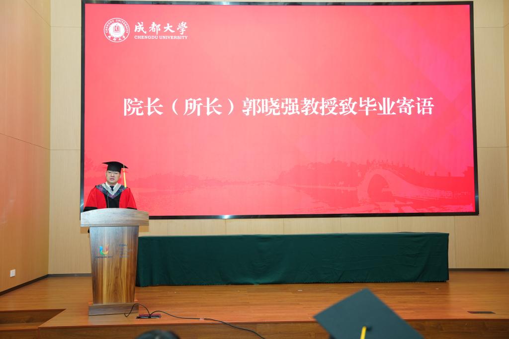 向圆满完成学业的全体毕业生致以最热烈的祝贺。他在致辞中深情回顾了同学们在成大药院求学的点滴成长,并对即将踏上新征程的学子们提出殷切期望。郭院长勉励大家要有坚守初心,永葆“仁心济世”的崇高梦想,也要有潜心治学,锤炼“守正创新”的时代担当,更希望同学们能够拥抱生活,书写“健康人生”的精彩华章。最后,他祝愿毕业生同学们在守护人类健康的伟大征程中,“大鹏一日同风起,扶摇直上九万里”,前程似锦,鹏程万里。