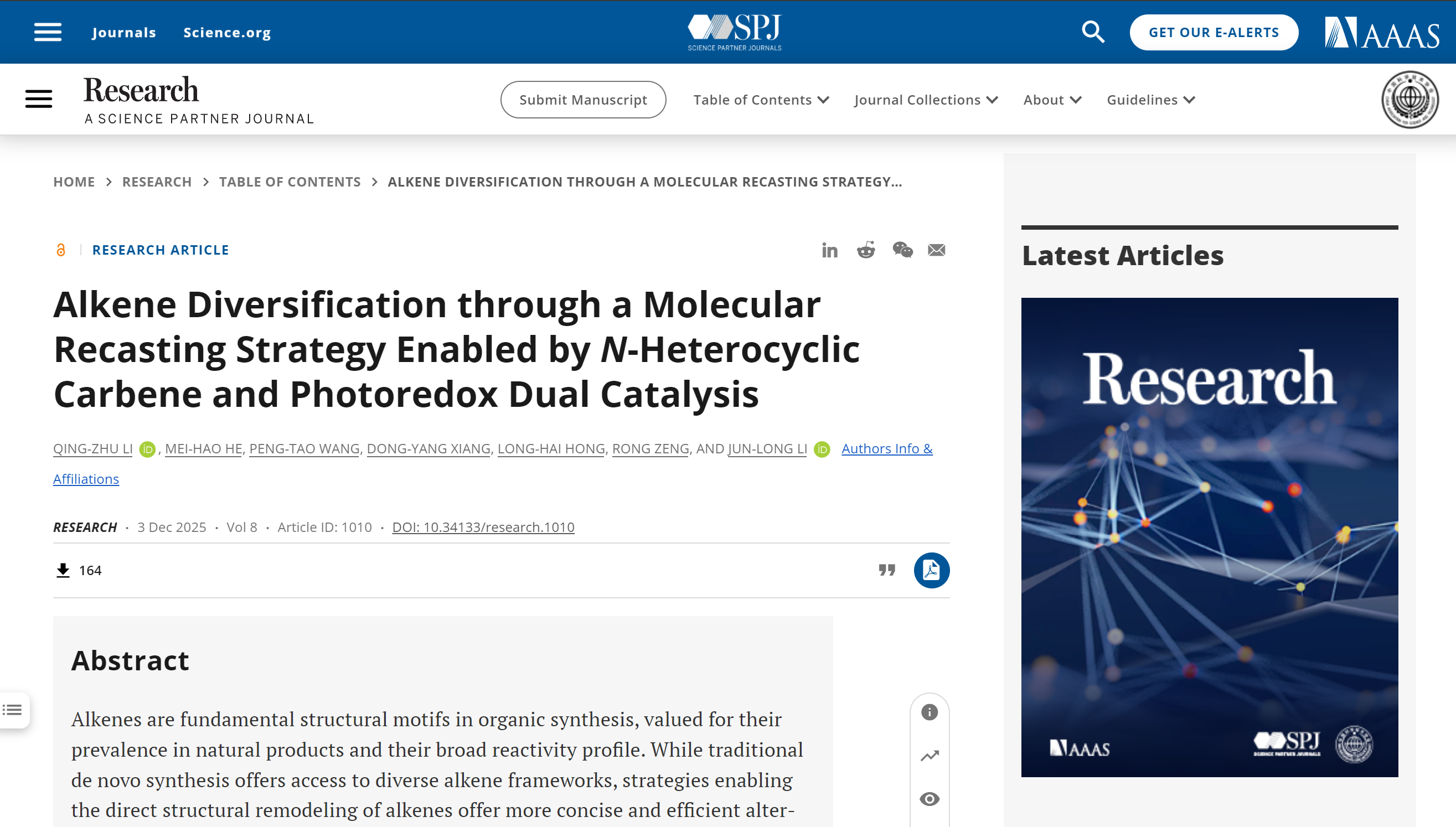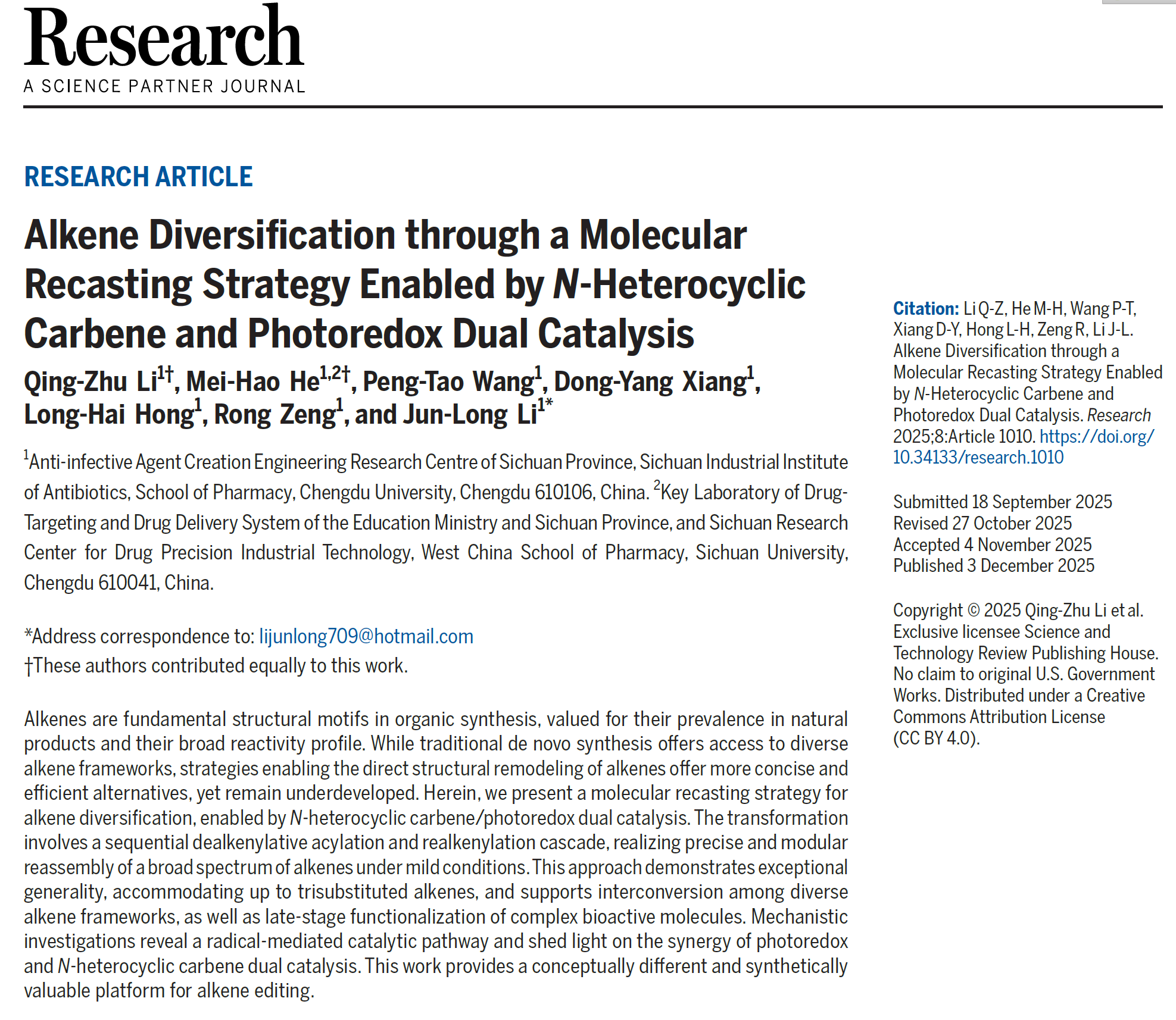 近期,国际著名学术期刊《Research》(该期刊为《Science》自1880年创刊以来的第一本伙伴期刊(Science Partner Journal, SPJ),中科院一区top,影响因子10.7)发表了我校手性及仿生合成研究团队的最新研究成果“Alkene Diversification through a Molecular Recasting Strategy Enabled by N-Heterocyclic Carbene and Photoredox Dual Catalysis”。成都大学为该成果的唯一通讯单位,体育平台