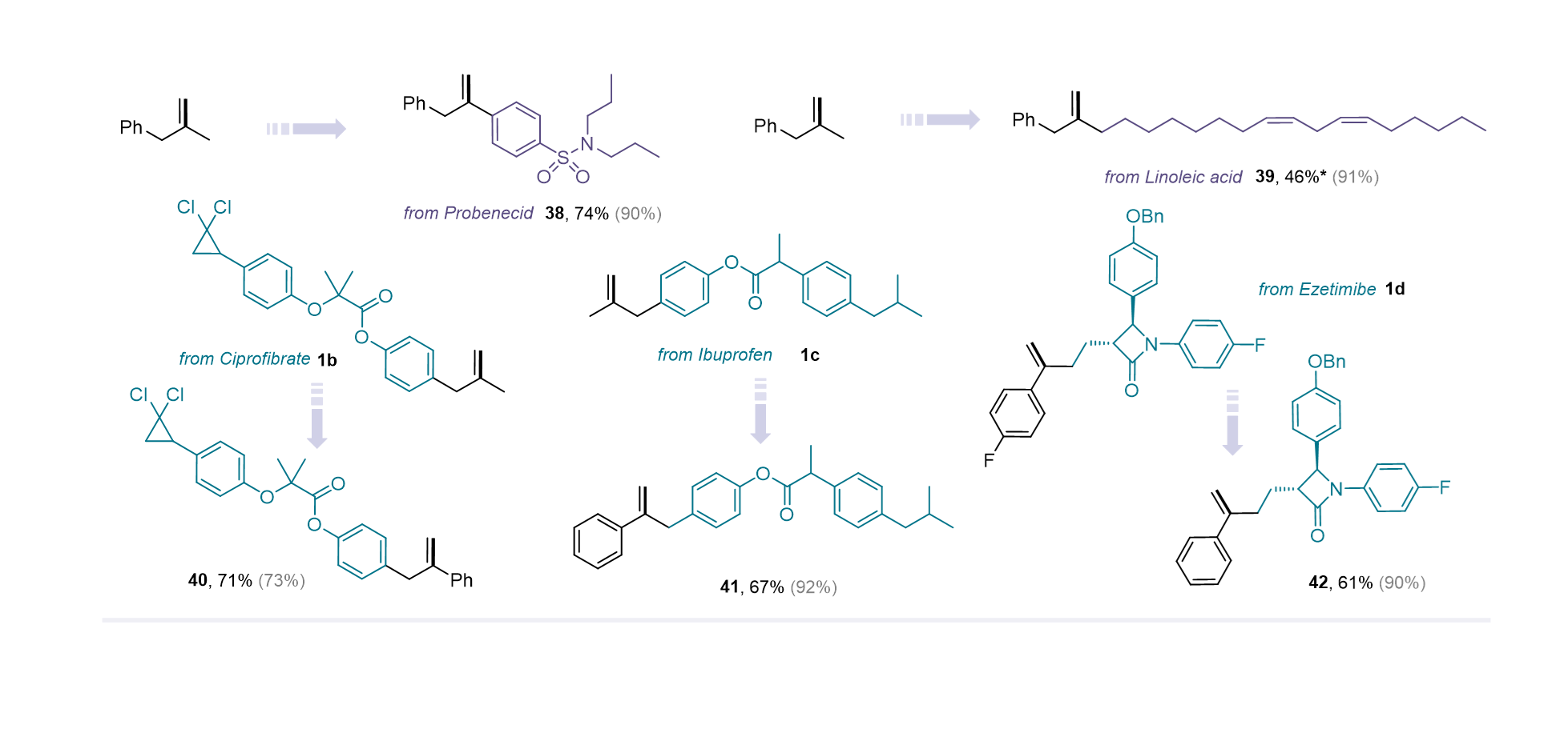 该方法展现出了极高的普适性,不仅能实现多种烯烃骨架间的相互转化,还具有重要的药学研究价值。该催化工具可直接用于多种药物和生物活性分子的官能团后修饰,如抗痛风药丙磺舒(Probenecid)、降胆固醇类脂肪酸亚油酸(Linoleic acid)、降血脂药环丙贝特(Ciprofibrate)、消炎镇痛药布洛芬(Ibuprofen)、胆固醇吸收抑制剂依折麦布(Ezetimibe)等。