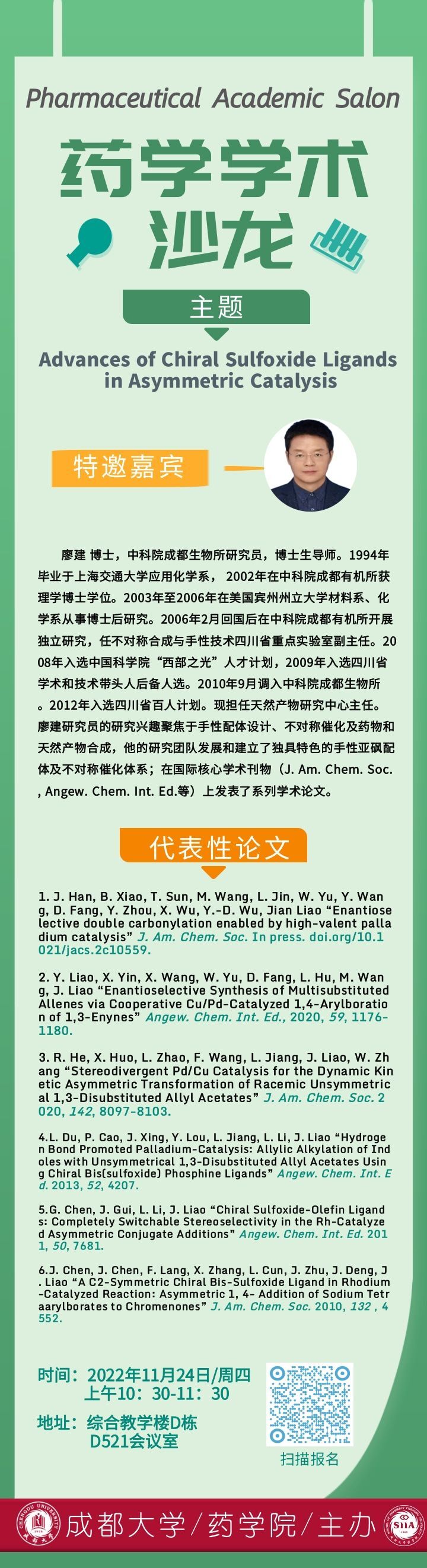【药学学术沙龙】Advances of Chiral Sulfoxide Ligands in Asymmetric Catalysis