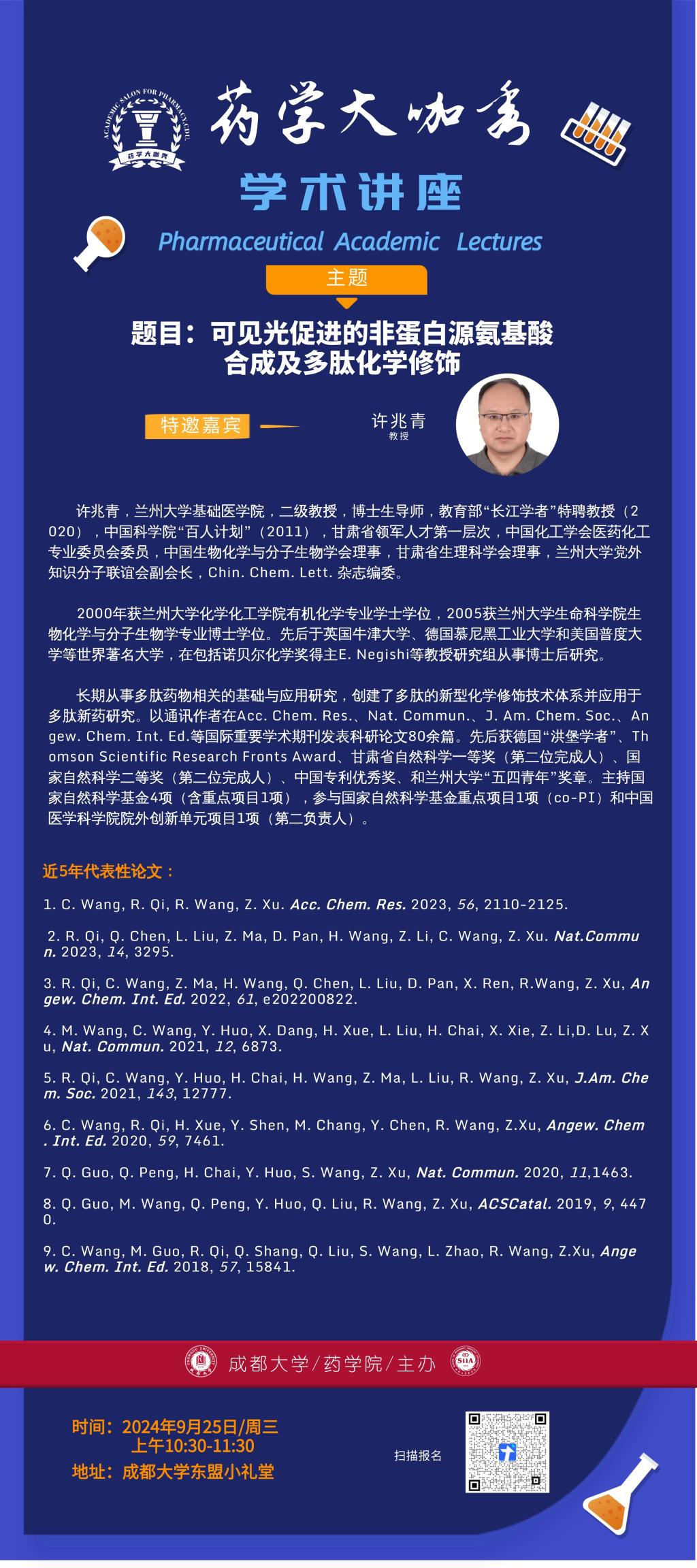 药学大咖秀丨许兆青:可见光促进的非蛋白源氨基酸合成及多肽化学修饰