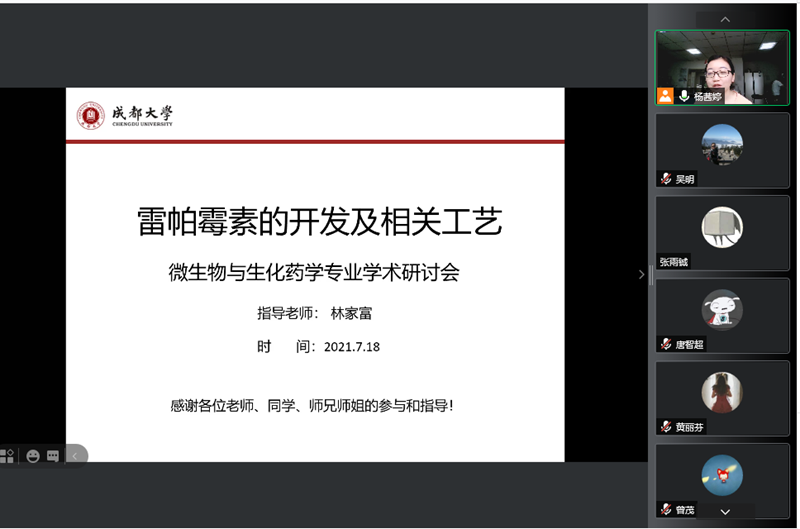 本网消息(文/图 陈沿言、吴明、龚华云)炎炎夏日,奋斗不止。7月18日下午,体育平台 2021年研究生学术论坛之微生物与生化药学专场研讨会如期线上举行。本次研讨会由2020级微生物与生化药学专业研究生承办,邀请林家富副研究员担任学术指导老师,川抗所2020级全体研究生及部分高年级学生参加研讨,教务办吴明和龚华云老师参会。