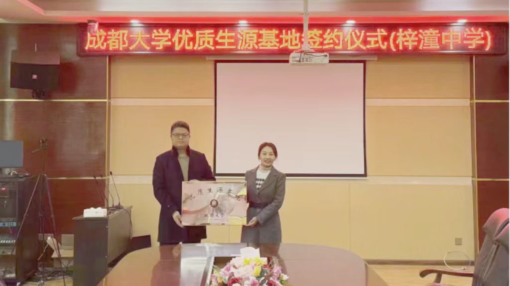 贾爱琼代表体育平台 向梓潼中学赠与了成都大学优质生源基地挂牌。