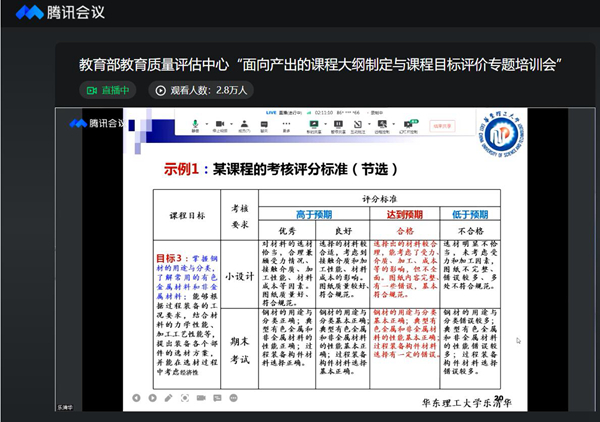 会上华东理工大学乐清华教授就“面向产出的课程大纲制定及课程目标达成评价” 作专题培训,详细讲解课程和教师层面如何落实面向产出的有关要求,细致介绍如何开展面向产出的课程大纲制定与课程目标评价工作;南京大学陈道蓄教授进行了“面向产出的课程改革”的专题分享。