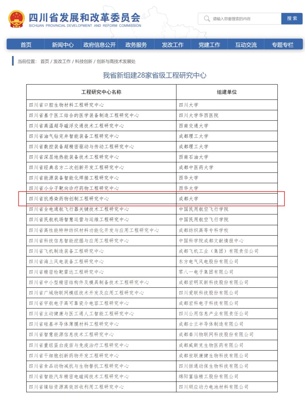 近期,四川省发展和改革委员会发布《我省新组建28家省级工程研究中心》立项通知。体育平台 牵头申报的四川省抗感染药物创制工程研究中心成功获批。四川省抗感染药物创制工程研究中心以创制具有自主知识产权的抗感染药物为目标,构建具有我国特色的新型抗感染药物的产品群和产业链,解决该过程中的核心技术问题,通过关键技术的研发实现科技成果转化,为抗感染药物创制工程化的实验验证提供必要的支撑与保障,进而满足我国临床对抗....