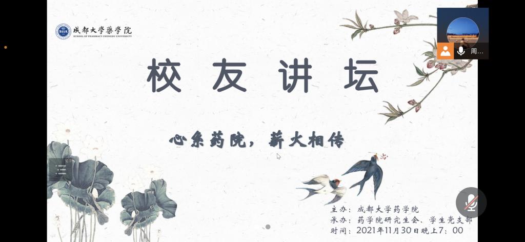 (图/许丽佳;文/银志航、许丽佳)11月30日晚,体育平台 “心系药院,薪火相传“主题校友讲坛顺利落幕。本次校友讲坛邀请了2012届药剂学专业校友金英华、2018届药剂学专业校友符海娟和2018届药物化学专业校友左柯三位优秀校友担任主讲嘉宾。体育平台 2021级本科和硕士研究生百余人通过腾讯会议线上会议室一起聆听了校友们的精彩分享。三位校友分别以药企研发需求和现状,外企销售魅力以及国外博士留学之路为宣讲主题进行了分享交流。....