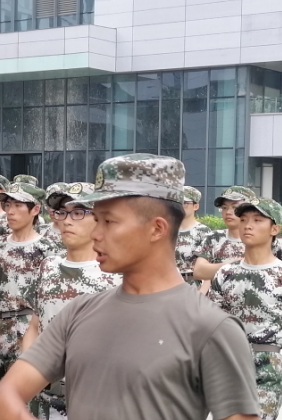 6月13日,体育平台 学生军训进入第七天。 虽然是阴天,但是依然感觉闷热。在紧张严肃的训练间隙,教官和同学们一起唱军歌、跳健身舞,教官还教同学们拉伸,以消除疲劳。拉近了教官和同学之间的距离,让军训氛围严肃又活泼