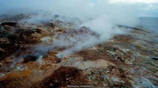 冰岛火山区发现的名为“Galdieria sulphuraria”的温泉红藻。 在冰岛首都雷克雅未克附近的一块岩石上,生长着一种名为“Galdieria sulphuraria”的温泉红藻。图中岩石上黄色的是硫磺沉积物,绿色的则是温泉...