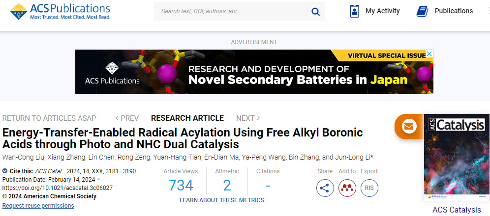 近日,体育平台 李俊龙教授课题组在催化领域国际著名学术期刊《ACS Catalysis》(中科院一区,IF:12.9)发表了一项题为“Energy-Transfer-Enabled Radical Acylation Using Free Alkyl Boronic Acids through Photo and NHC Dual Catalysis”的最新研究成果。成都大学为该成果的唯一通讯单位,2021级硕士研究生刘万聪为该论文的第一作者,特聘副研究员张翔为共同第一作者,李俊龙教授为本论文的指导教师和通讯作者。该研究工作通过....