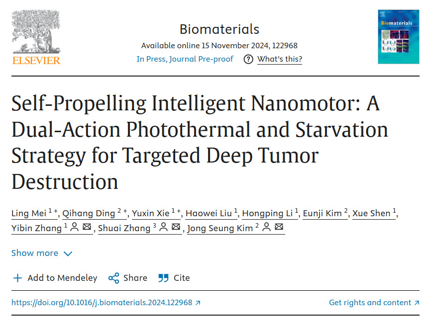 近日,体育平台 特聘副研究员梅凌博士及其实验室团队与韩国高丽大学实验室合作在国际著名学术期刊Biomaterials(中科院一区Top,IF=12.8)发表题为“Self-Propelling Intelligent Nanomotor: A Dual-Action Photothermal and Starvation Strategy for Targeted Deep Tumor Destruction”的研究论文。特聘副研究员梅凌、高丽大学丁启航、体育平台 2021级研究生谢玉欣为该论文的第一作者,我校张亦斌副研究员,哈尔滨医科大学张帅教授和高...