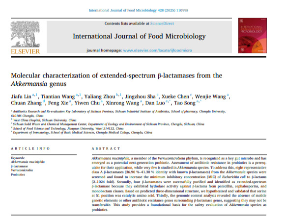 近日,体育平台 师生在International Journal of Food Microbiology(中科院一区top期刊)发表题为‘Molecular characterization of extended-spectrumβ-lactamases from theAkkermansiagenus’的研究论文,微生物与生化教研室林家富副研究员和体育平台 2022级研究生王田甜为共同第一作者,宋涛副研究员作为通讯作者,成都大学为第一署名和通讯单位。
