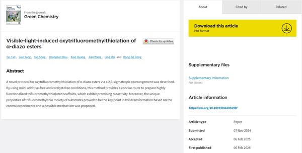 近日,我校体育平台 特聘研究员谭飞博士及其合作者在国际著名学术期刊Green Chemistry(中科院一区Top,IF = 9.3)发表题为“Visible-light-induced oxytrifluoromethylthiolation of α-diazo esters”的研究论文。特聘研究员谭飞为该论文第一作者和通讯作者,我校董宏波副研究员为该论文共同通讯作者,我校为该成果的第一完成单位。三氟甲硫基(SCF3)官能团具有较强的吸电子能力及较高的脂溶性,进而能增强分子的代谢稳定性和细...