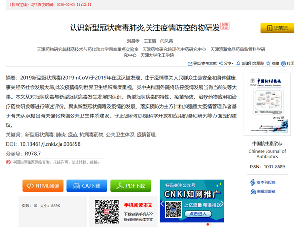 2月5日,《中国抗生素杂志》主编刘昌孝院士发表主编专论《认识新型冠状病毒肺炎,关注疫情防控药物研发》,《中国抗生素杂志》与中国知网合作采用网络首发方式快速在线发布。 基于当前疫...