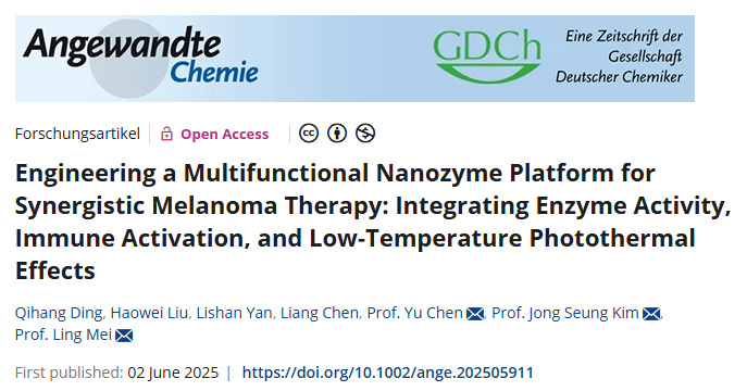 近日,我校体育平台 师生与上海大学、韩国高丽大学合作,在国际顶级学术期刊Angewandte Chemie(中科院一区Top,IF=16.1)发表题为"EngineeringaMultifunctionalNanozymePlatformforSynergisticMelanomaTherapy:IntegratingEnzymeActivity,ImmuneActivation,andLow-TemperaturePhotothermalEffects"的研究性论文。研究生丁启航、刘豪威为论文的共同第一作者,上海大学陈雨教授,高丽大学JongSeungKim院士、成都大学特聘副研究员梅....